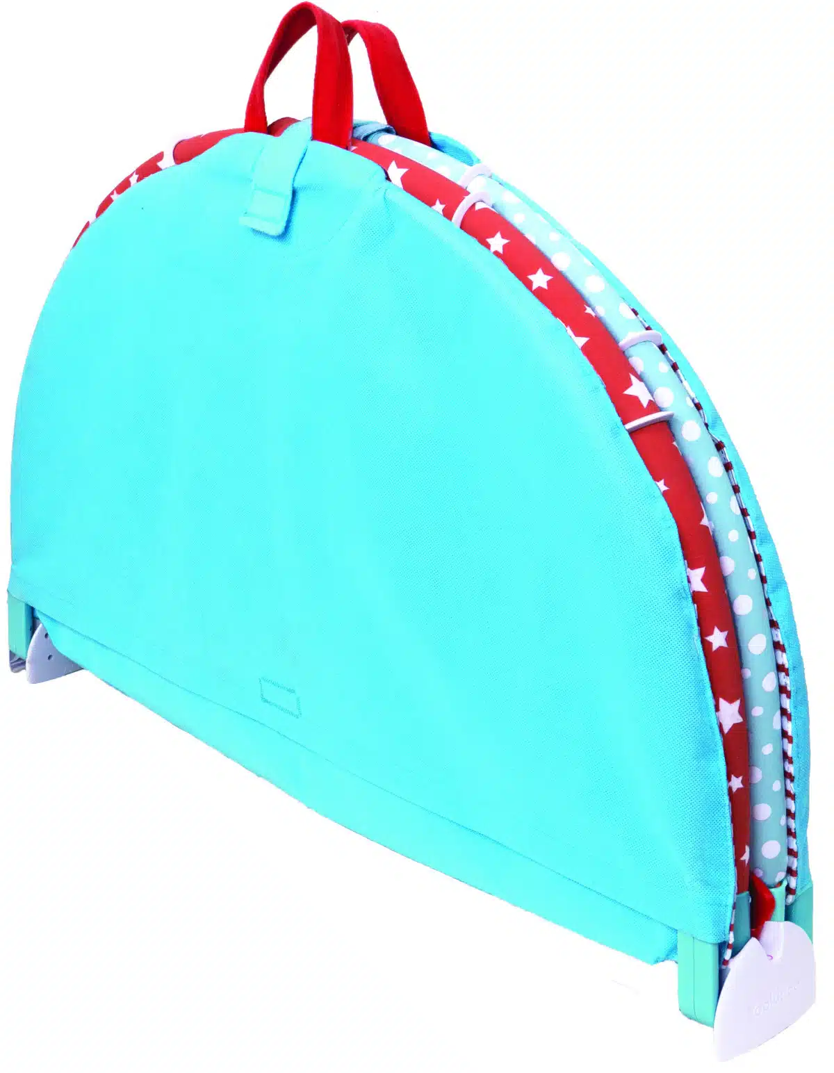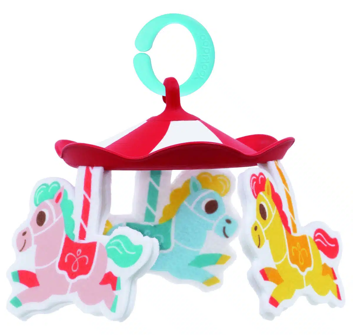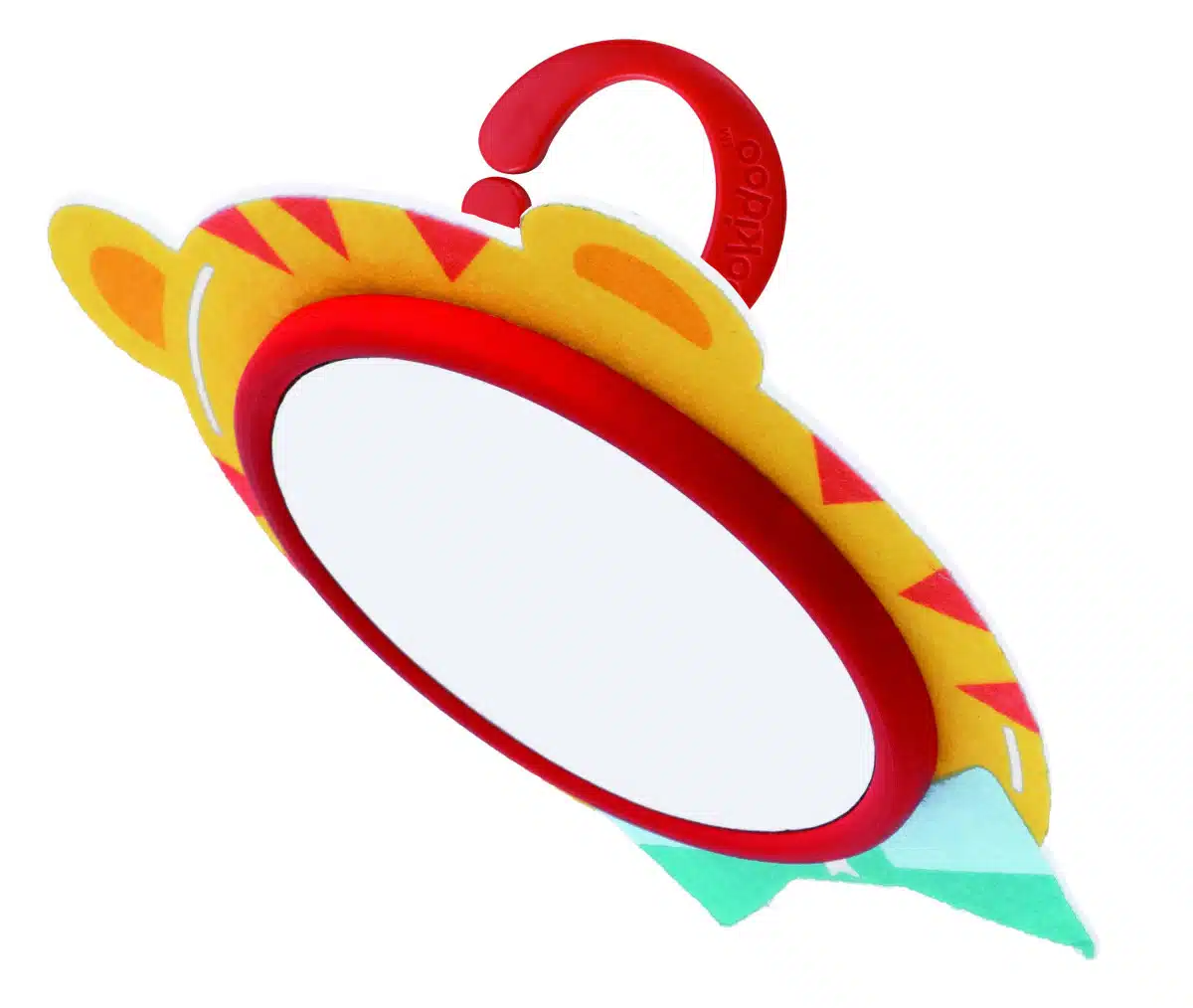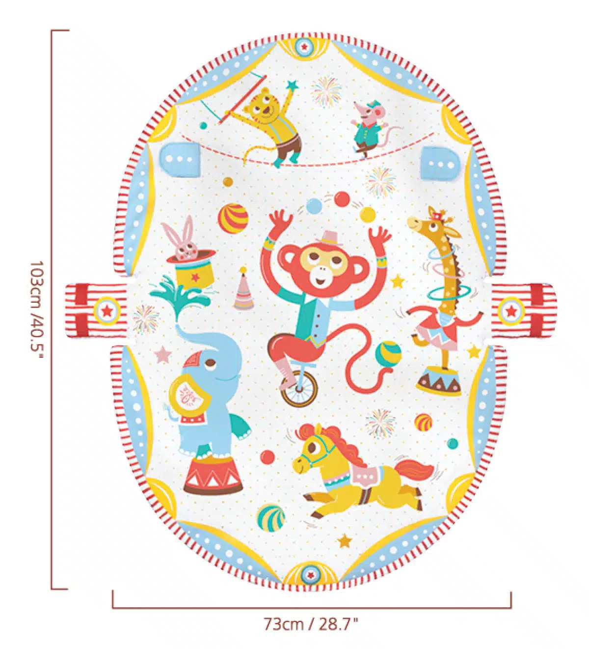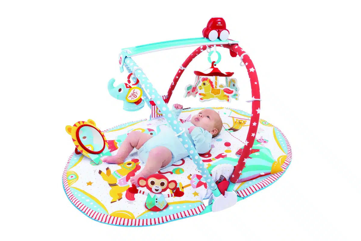 Een 3-in-1 speeltapijt met circusthema en veel accessoires. Het heeft twee pluche figuren – een funky aap en een lieve olifant, een draaimolen en een grote babyveilige spiegel die op de mat kan worden opgehangen of gestut.